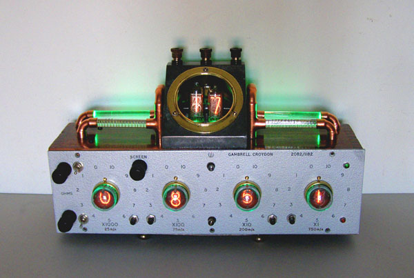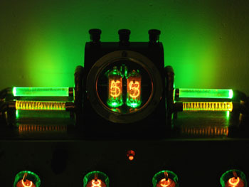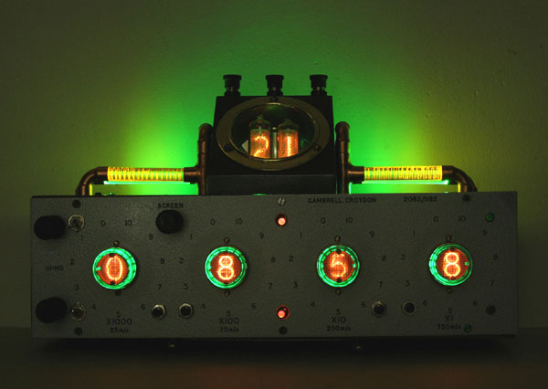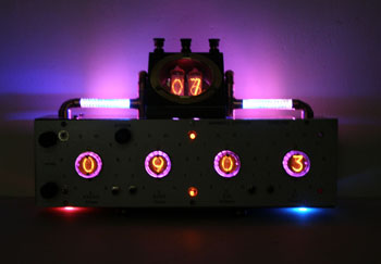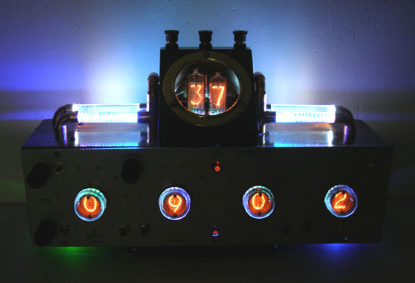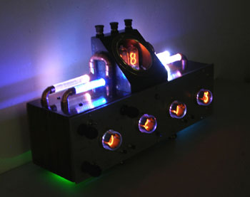A `porthole` style clock inspired by early submarines such as the `Ictineo 1` or the `Nautilus`. Turret made from an old bench ammeter enclosure now housing the second digits. Hours and minutes are handled by ZM1020 tubes. Colour changes every hour and switchable `Frankenstein` flickering effect. Pools of random colur changing underneath add to the undersea dreamy effect.