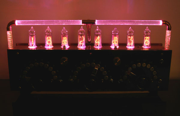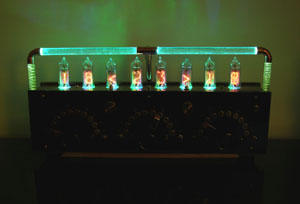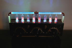 Another variant based on one of the Philip Harris decade resistor boxes from the 1940`s - surely one the most elegant of these devices. This one has eight Nixie tubes! - six IN-14 tubes with the 18mm high digits and two seperator colons provided by switchable flashing In-19 symbol tubes which have the same properties but display either dB, <,>,A/B, ~,+,- , or Mu. There are also a pair of conventional neons. Powered by a PV Electronics QTC clock kit which changes the underlighting and lumitron tube colours hourly etc. and provides many programmable features. Also a flickering `Frankenstein` tube at each end, intensity controlled by the left hand dial. The front panel has been set away from the main wooden case using a transparent acrylic spacer, allowing the internal LED`s to cast a glow under and around the clock. Quite a headache to fit all the electronics in - but worth it I think for the unusual display.