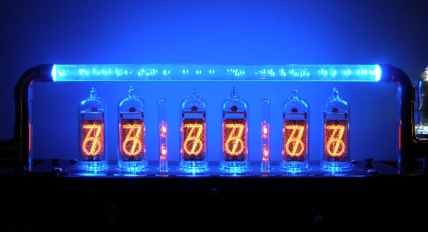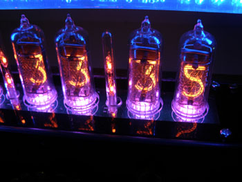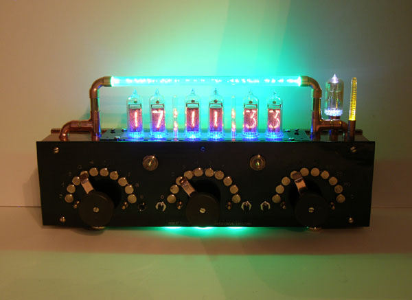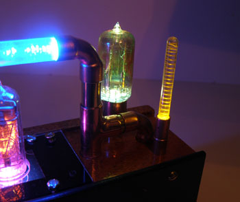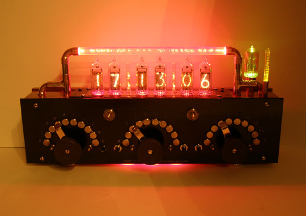 A `Mentalpiece` clock version with a `bubble` light bar above the tubes - the bubbles are cast in the bar and pick up the lighting effects beautifully! Remote controlled colour changes and effects in the bar and also the triple pools of light underneath. On the right is a colour changing valve and a flickering `lumitron` tube - both controlled by the dials on the front. The clock is a more straightforward unit which displays the time and rotates the numbers in unison each minute - which is a nice effect. Several colour options for the tube lighting are controlled by a push button. An easy clock to set up without a complicated programming routine.