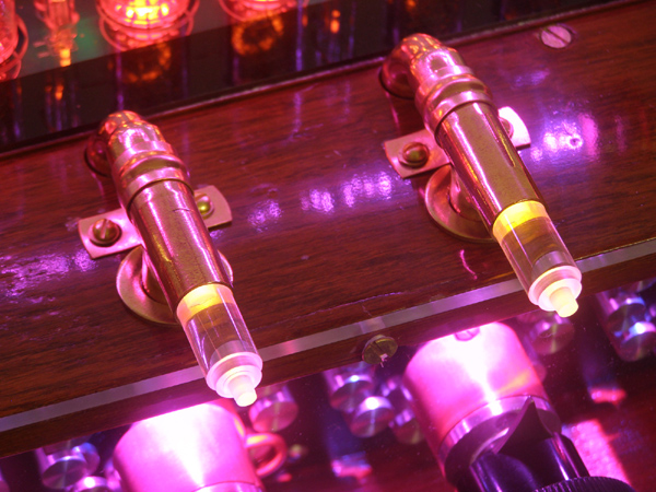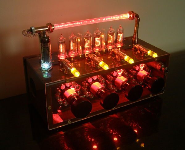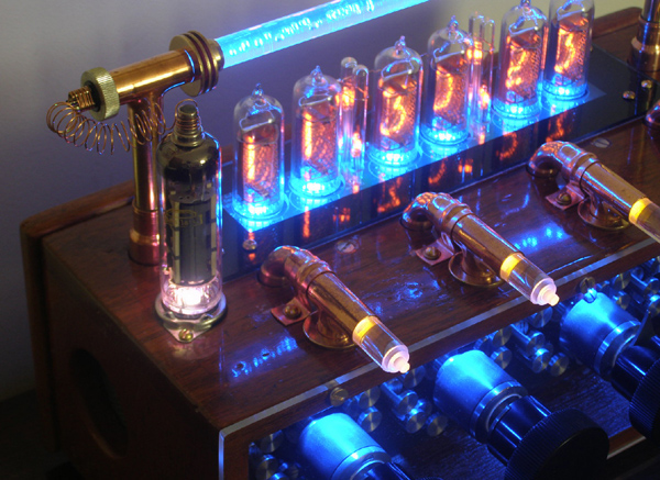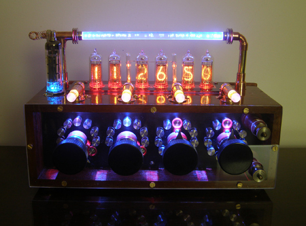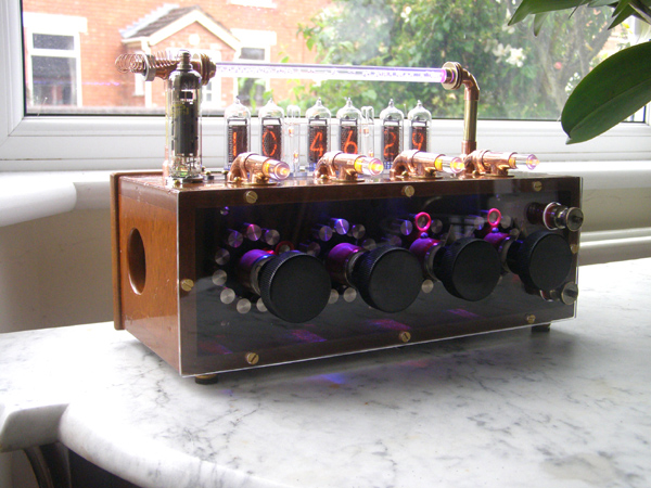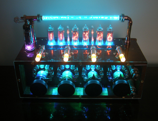Inspired by the grouping of gun flashes on a WW2 Spitfire, this clock has an arrangement of four flickering `cannons` along the front edge. The original front panel of the reistance box has been replaced with a perspex version, allowing the intricate dial mechanism to become visible, which was originally hidden by a steel front panel. Something of the `Gatling gun` about this! Front panel and upper light tube are infra red controlled for colour changes and effects. Valve on the left is colour changing and the row of flickering lights can be varied in intensity. Clock is a straightforward unit which is very easy to program.