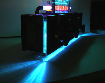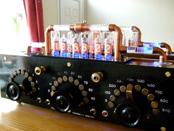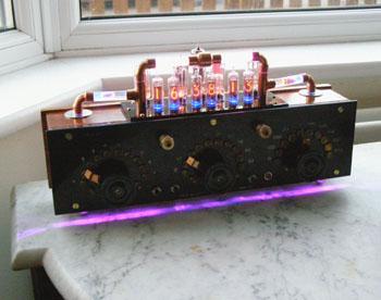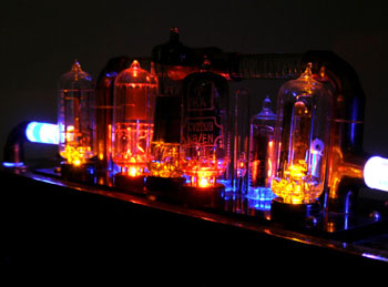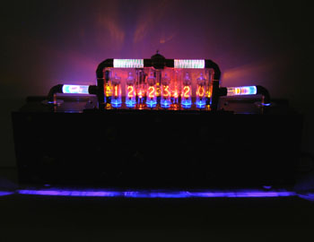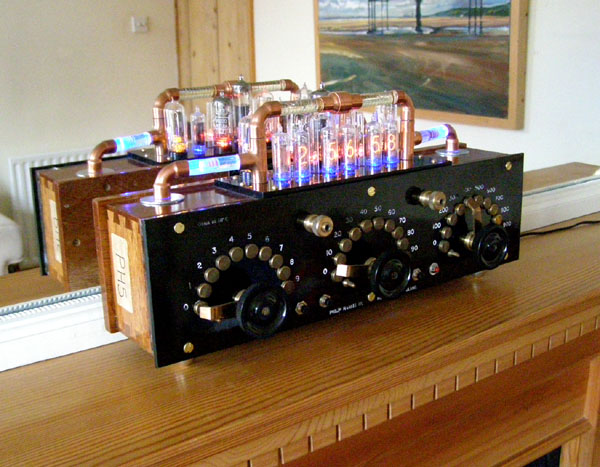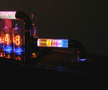 Based on an old Philip Harris decade resistance box, this clock has some interesting functions controlled by the original controls in addition to its own remote controlled lighting. The clock uses Russian IN-16 Nixies, an elegant slender design and has blue underlit tubes. The front panel has been set away from the main wooden case using a transparent acrylic spacer, allowing the internal LED`s to cast a glow under and around the clock. These and the top light bar are controlled by a remote, which provides many colour effects both static and dynamic, 7 colour cycling, fading etc. LED`s in the resistor tubes either end provide a blue and/or flickering amber effect, adjusted and dimmed by the original dials on the front. These also switch on or dim the row of old radio valves at the back which are lit from underneath - these can be changed at will for other valves which fit the sockets! Clock settings and alarm are controlled by the row of push buttons on the front panel which also has a red alarm indicator LED. As the name suggests this clock looks great on a mantlepiece - especially if fronting a mirror! The video shows all the lighting effects on at once - though these can be switched on or off individually to create the desired effect.
